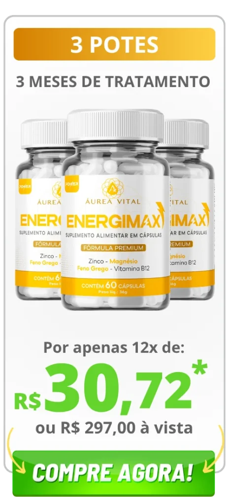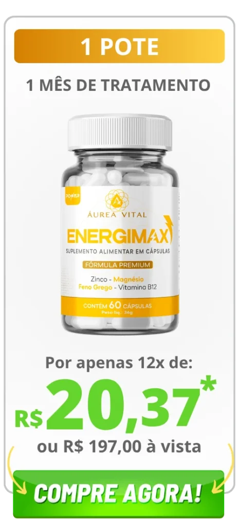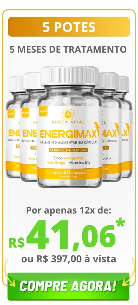 O Energimax é tão eficaz porque vai além de uma simples “dose de energia”. Sua fórmula combina vitaminas e minerais essenciais — como Vitamina D, C, Zinco, Magnésio, Cromo e Feno-grego — que atuam diretamente nas causas da fadiga, da falta de foco e da baixa imunidade.